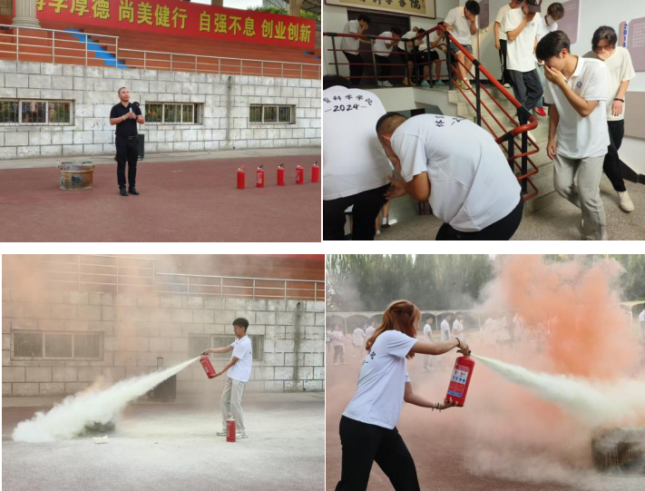 会后,在北区操场,白教官组织师生们开展了消防安全技能培训和应急疏散演练。他详细讲解了安全疏散路线的选择方法、灭火器的正确步骤,并进行了灭火器的实操演示。师生们踊跃参与,亲身体验,有效提升了实际操作技能。