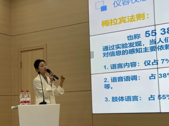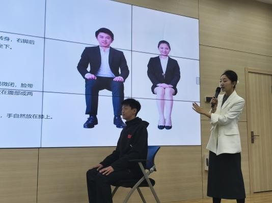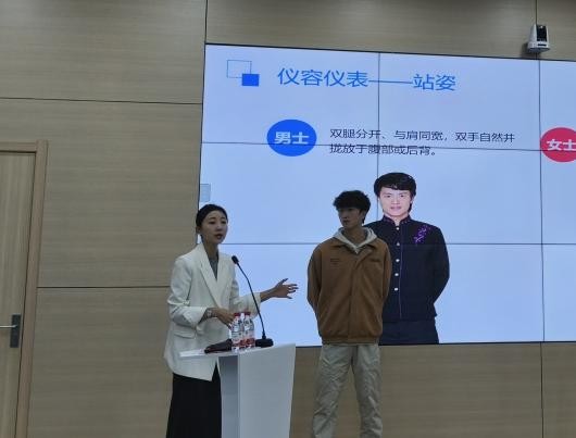 会上,张睿老师凭借丰富的经验,从仪容、表情、站姿、走姿等七个维度,深入浅出地讲解了面试中脱颖而出的关键要素。同时,为了让同学们更直观地理解,还邀请员工上台进行互动,生动的讲解了站姿、坐姿的正确要素。通过生动的展示,清晰明确地呈现了在各类职业面试时应保持的仪容仪态与待人礼节,诠释了“第一印象”的关键性。